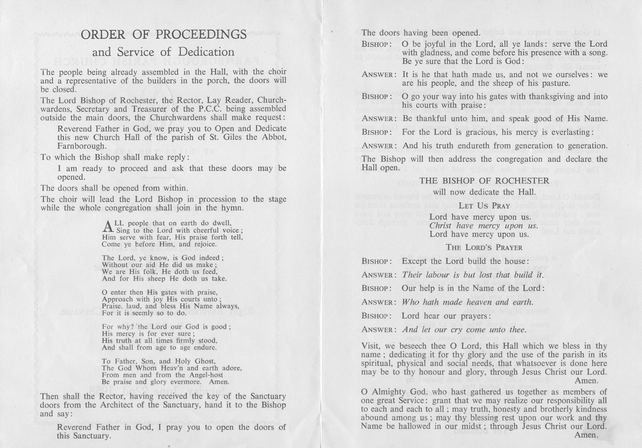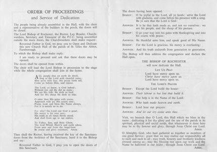 After a shortened form of Evensong in the Church, the Clergy, Choir and Congregation (which included the Chairman of the Orpington Council, Councillor C.H.E.Pratt) processed to the Hall. With the many others, including Mr. Donald Sumner, O.B.E. M.P., who had already assembled, they witnessed the Dedication of the Sanctuary by the Lord Bishop of Rochester, the Right Reverend Christopher M. Chevasse. It would be an impossible task to mention all who had worked towards the erection of the Hall but some, by virtue of their office in the church or by special personal qualifications, were able to render especial service. Among those were, the Rector, the Revd. A.A. Chapman, Rural Dean of Orpington; Bishop Guy Warman; the Churchwardens, Mr. L.J. Newling and Mr. D.K. Fairbairn; the Treasurer and Secretary of the Parochial Church Council, Mr. K. Deals and Mrs. S. Stead; Mr. J.W.W. Sachs (legal matters) and the Secretary of the Appeals Committee and the Church Hall Committee, Mr. P.J. Reeves. To all who helped by labour or by gift, the Rector and the Council offer grateful thanks.