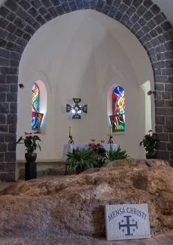We had three communion services in the course of the ten days, the first being at Tabgha, believed to have been the site where Jesus fed the five thousand. Everywhere we went on our pilgrimage others were going by coach too. Every holy site and church was managed by a Christian denomination, often Franciscan but also Orthodox, Catholic or Protestant. In the grounds of each site there were groups of seats often around a simple table where the parties of pilgrims and their leader could talk and worship together. This meant that while we were listening to Alison or Sayeed we could hear on all sides devotions and faint singing in many other tongues. At Tabgha on that Saturday morning we were able to celebrate our communion together away from the sun quietly under trees on the shore of the Sea of Galilee. One gets the impression the Feeding of the Thousands at the time was also very pleasant (“There was plenty of grass in that place”. John 6 v 10), but rather more fraught, with the disciples asking Jesus for advice and then organising loaves and fishes and the clearing-up afterwards.