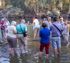 Then we journeyed south to the river Jordan at the point where John the Baptist is said to have baptised Jesus. Here the trees and vegetation went down into the cool of the water and we took off our shoes and sandals and paddled (with the small fish nibbling at our toes), renewing our baptismal vows.