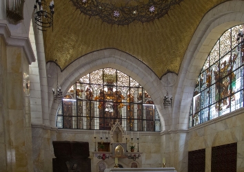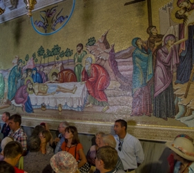 A short coach ride across Jerusalem took us to St Peter in Gallicantu (from the Latin for the cock crowing) and the possible site of the High Priest’s house. The basilica over this site was built in AD457 and we descended the rock-hewn steps beneath it to view a series of cell-like caves. At the deepest level was a large hole in the ground with the original entrance halfway up a sheer wall, so that once a rope or ladder was withdrawn the prisoner(s) would be shut in a black and soundless pit without any hope of escape. We all stood shoulder to shoulder there and listened to the reading of psalm 88, “...You have put me in the lowest pit, in the darkest depths...” Was this the prison where Jesus spent his last night before state execution?
